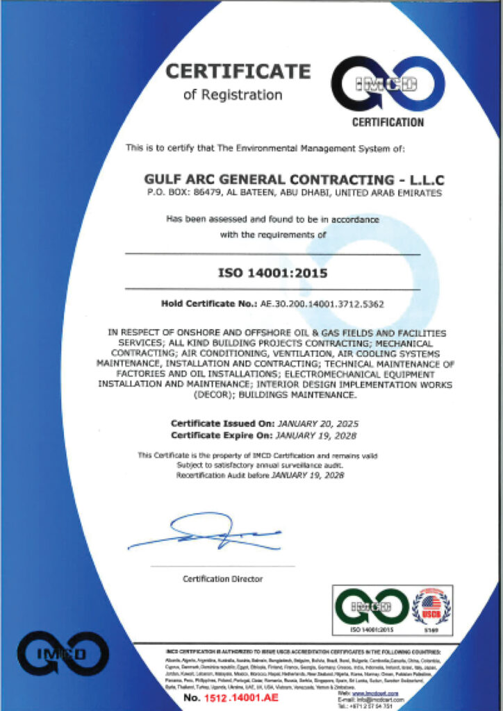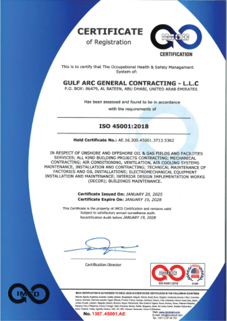 Gulf Arc General Contracting LLC proudly holds ISO 9001:2015, ISO 14001:2015, and ISO 45001:2018 certifications. These accreditations reflect our unwavering commitment to quality, environmental responsibility, and occupational health and safety. Our operations are guided by a fully integrated QHSE management system, ensuring consistency, compliance, and continuous improvement